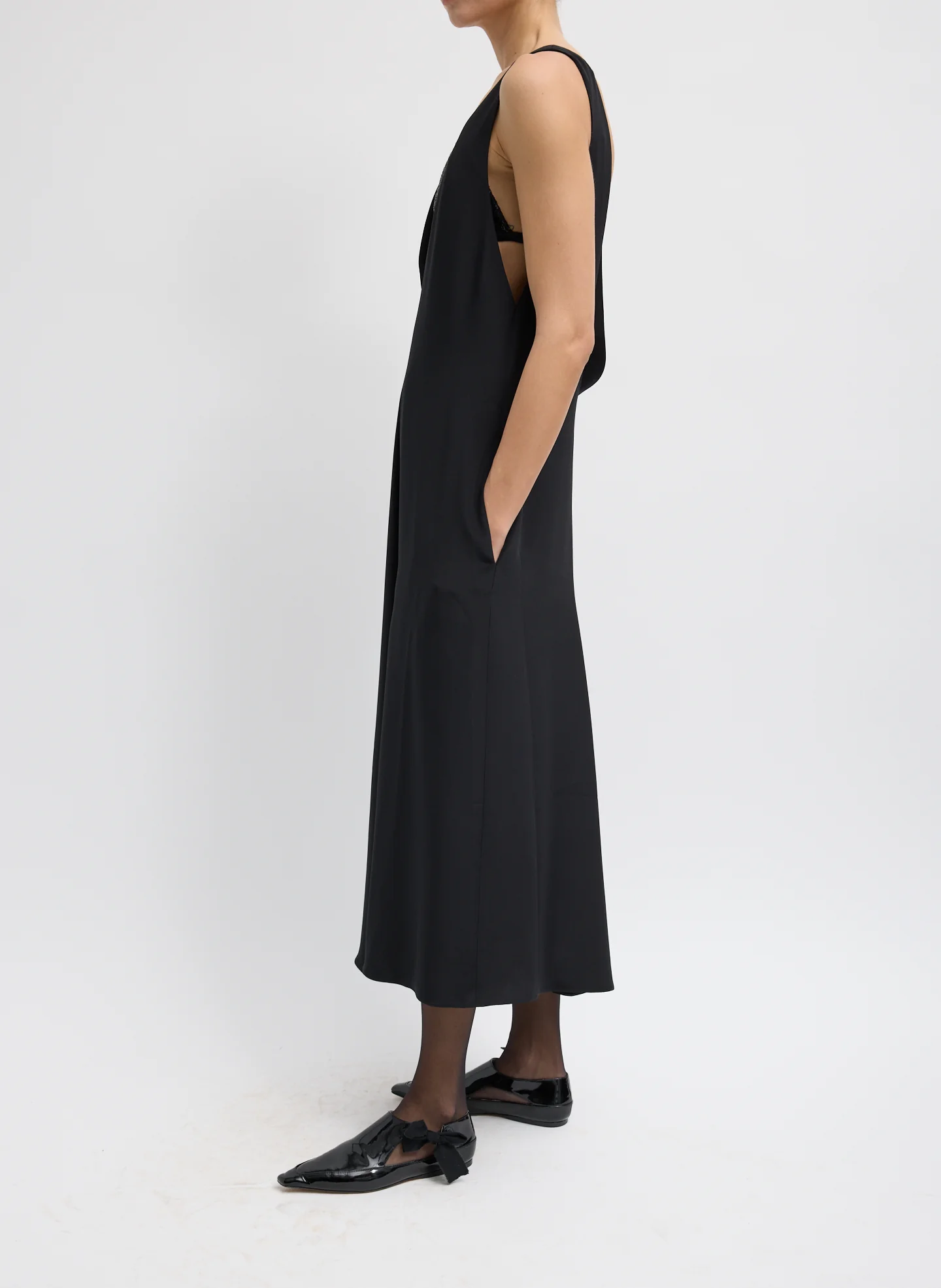 - Sleeveless black midi dress with a relaxed, flowy silhouette