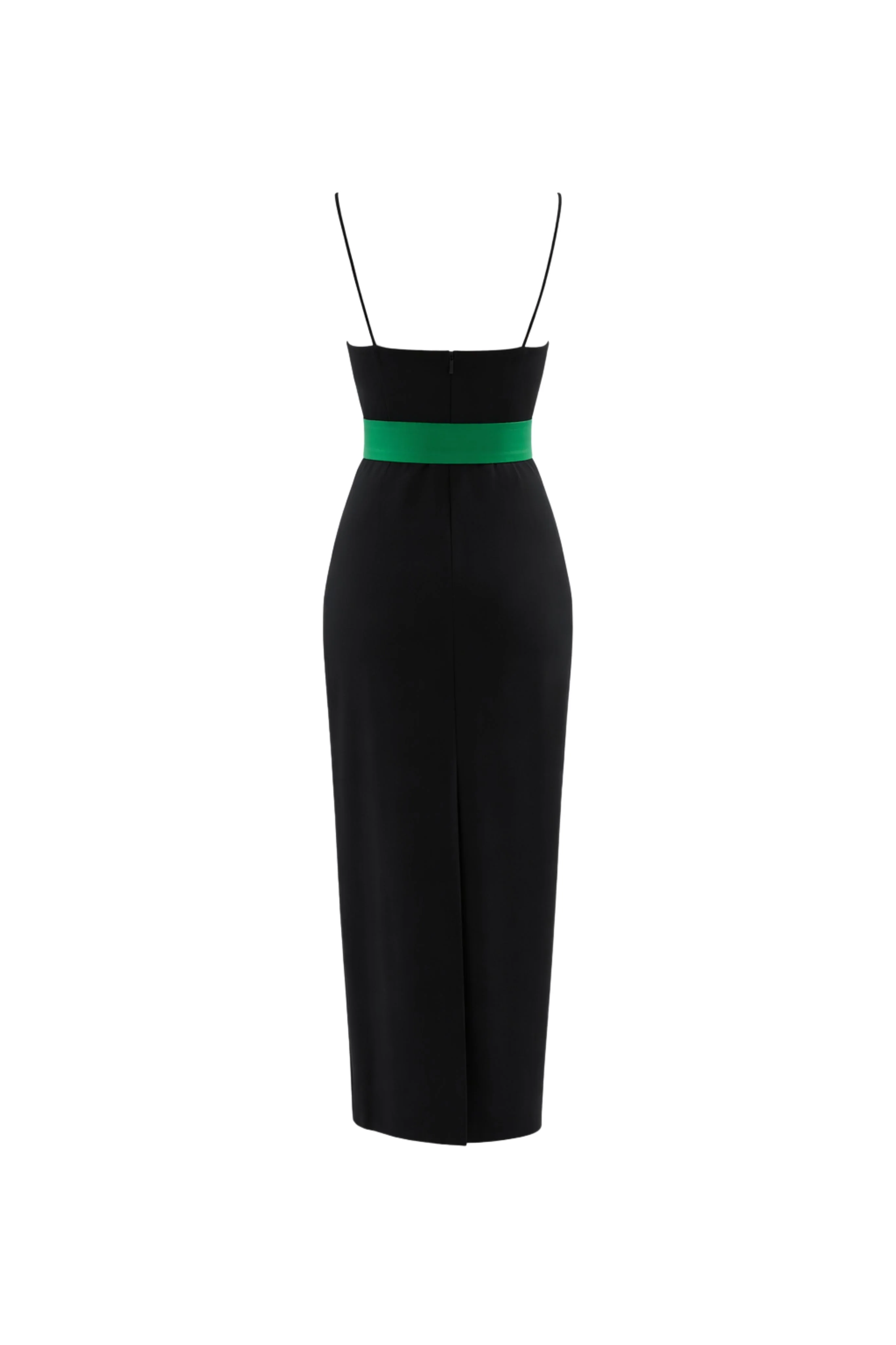 - Elegant black midi dress with deep V-neckline and delicate spaghetti straps